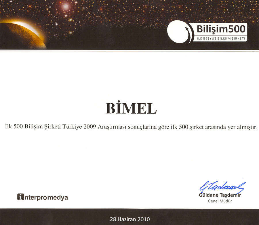 - Bimel 2009'da da ilk 500 Bilişim Şirketi içinde yeralmıştır.