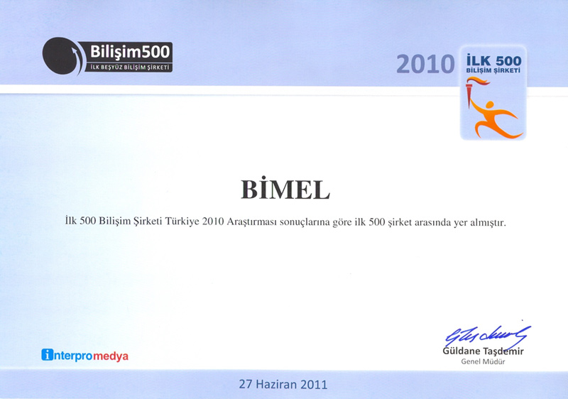 - Bimel 2010'da da ilk 500 Bilişim Şirketi içinde yeralmıştır.