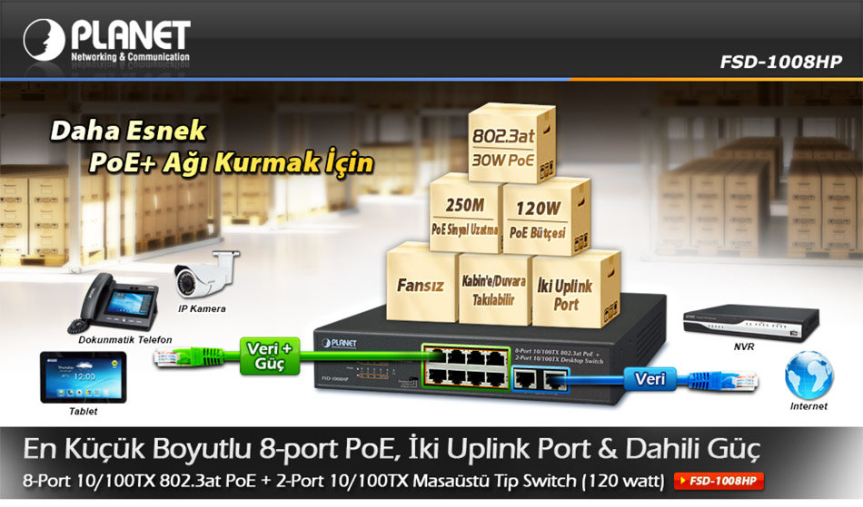 PLANET FSD-1008HP üzerinde sekiz adet 10/100TX port'a sahiptir. Port başına 30-watt 802.3at PoE+ güç beslemesi yapabilmektedir. Toplamda 120-watt PoE bütçesine sahiptir. Ek olarak üzerinde iki adet uplink port bulunmaktadır. Yüksek performanslı ağlar ve küçük ölçekli Wi-Fi sistemleri için ideal bir üründür. Masaüstünde kullanılabilecek fiziksel kompakt bir yapıya sahiptir. Bu sayede her yere konumlandırabilir ve PoE ile beslenen cihazlara pratik şekilde güç beslemesi yapılabilir.