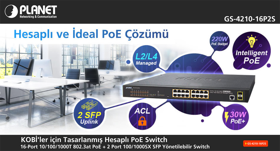 PoE ağı kurarken güvenlik de önemli, network trafik yönetimi de önemli diyorsanız sizin için ideal bir üründür PLANET PL-GS-4210-16P2S. Layer 2 switch ve yönetim özelliklerini barındırır. Kullanıcı dostu yönetim arayüzüne sahiptir. IEEE 802.3at Power over Ethernet Plus (PoE+) özelliklerini hesaplı bir yatırımla sunuyor. 16-Port 10/100/1000T 802.3at PoE+ Injector ve 2-Port 100/1000BASE-X mini-GBIC/SFP yuvaya sahip.