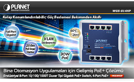 Duvar tipi kabinet içine yerleştirilmek üzere tasarlanan PLANET WGS-814HP, yenilikçi, önden erişime imkan tanıyan, duvar yüzeyine monte edilebilen endüstriyel 8-port Gigabit Ethernet Switch ürünüdür. Üzerinde 4 adet 802.3at PoE+ güç beslemesi yapabilen (maksimum 60 watt güç çıkış bütçesine sahip) port bulunmaktadır. Kompakt, IP30 metal şasiye sahiptir. Çalışma ısısı -20 ila 60 derece C arasındadır.