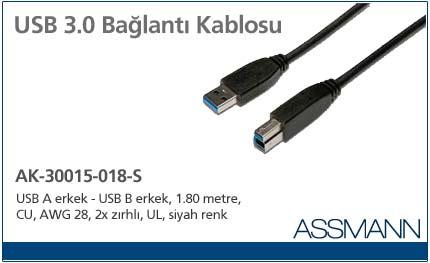 USB 3.0 Bağlantı Kablosu, USB A erkek - USB B erkek, 1.80 metre, CU, AWG 28, 2x zırhlı, UL, siyah renk