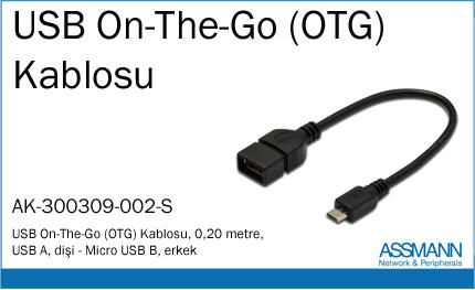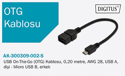 Digitus USB On-The-Go (OTG) Kablosu, 0,20 metre, AWG 28, USB A, dişi - Micro USB B, erkek