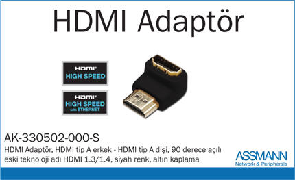 HDMI Adaptör, HDMI A erkek - HDMI A dişi, 90 derece açılı, siyah renk, altın kaplama