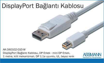Digitus DisplayPort bağlantı kablosu, mini DP - DP St/St, 1.0m, kilitli, DP 1.1a uyumlu, beyaz