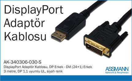 Digitus DisplayPort adaptör kablosu, DP tipi - DVI (24+1) St/St, 3.0m, kilitli, DP 1.1a uyumlu, bw