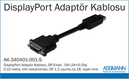 Digitus DisplayPort (DP) <-> DVI-I Adaptörü, Kablolu, DP Erkek - DVI-I (24+5) Dişi, 0.15 metre, kilit mekanizmalı, DP 1.2 uyumlu, 2x zırhlı, UL, nikel kaplama, siyah renk