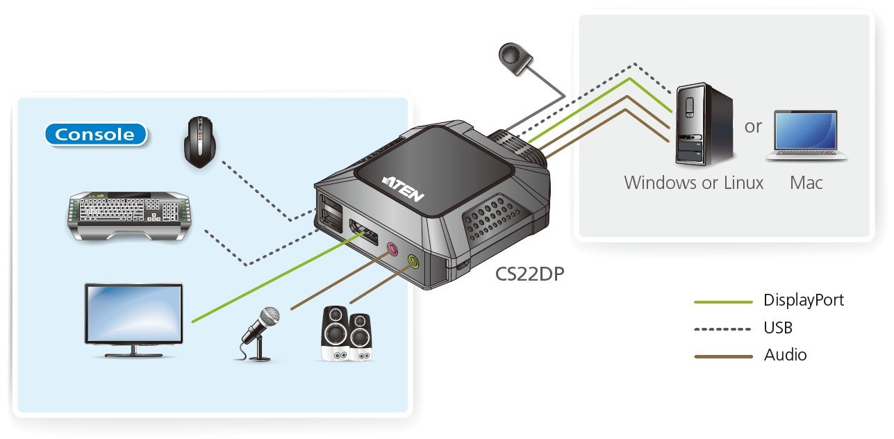 1 x ATEN-CS22DP 2-Port USB DisplayPort Kablolu KVM Switch