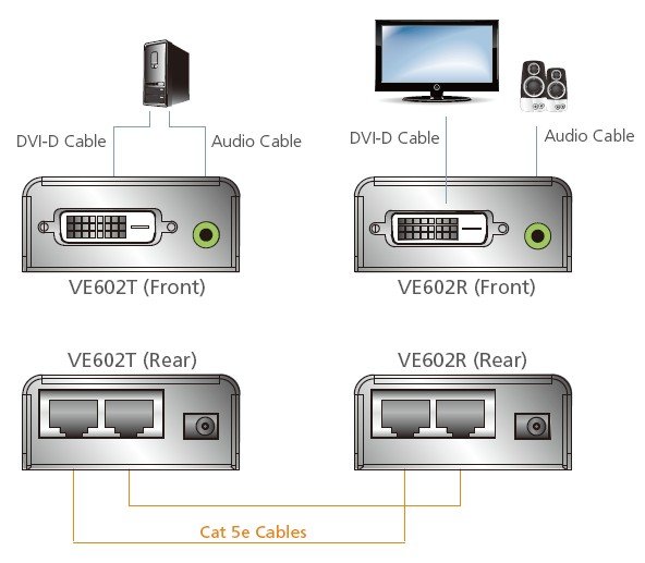 DVI kaynak cihazından gelen görüntü ve ses sinyalinin 60 metre uzaktaki DVI ekrana iletilmesini sağlar.
