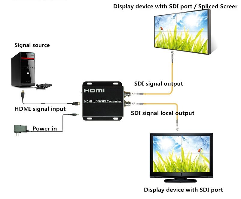 HDMI görüntü ve ses sinyalinin 3G SDI video arayüzünden izlenmesini sağlar. Çeviricinin çıkış port'una iki adet 3G SDI video arayüzünü destekleyen cihaz takarak kaynak HDMI görüntüyü iki adet 3G SDI teknolojisine sahip cihazda izlemek mümkün hale gelir.
