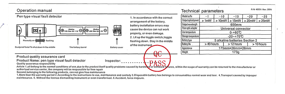 Pen Type Visual Fault Locator/Detector, optical output power > 20mW, 2.5mm Universal Connector