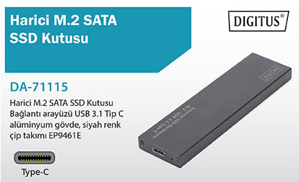 Digitus Harici M.2 SATA SSD Kutusu, Bağlantı arayüzü USB 3.1 Tip C, alüminyum gövde, siyah renk, çip takımı EP9461E