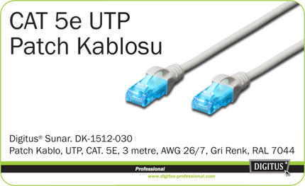 Digitus Patch Kablo, UTP, CAT. 5E, 3 metre, AWG 26/7, Gri Renk, RAL 7044
