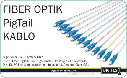 Digitus SC/PC Fiber PigTail, Semi Tight Buffer, 9/125 µ DIN IEC 304 renk kodlu, singlemode, uzunluk 2 metre, Class OS1, birim fiyatıdır