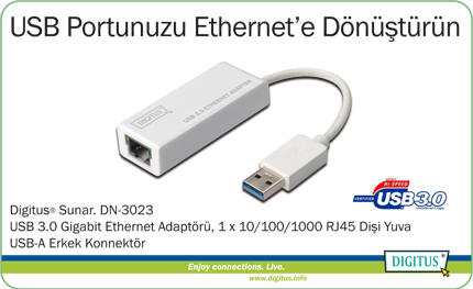 Digitus USB 3.0 Gigabit Ethernet Adaptörü, 1 x 10/100/1000 RJ45 Dişi Yuva, USB-A Erkek Konnektör