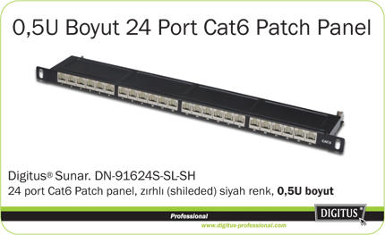 Digitus 19 Inch 24 port Cat.6 Patch Panel, Zırhlı (Shielded), siyah renk, 0,5U boyut