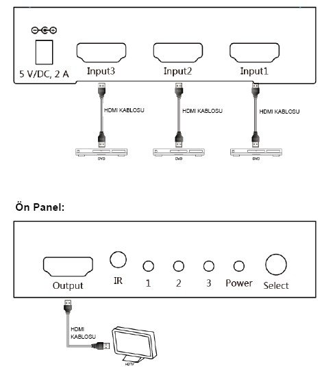 HDMI bağlantı teknolojisini destekleyen LCD, Plazma Televizyonlar gibi görüntü aktarım ürünlerine bağlanabilir. Giriş portlarına HDMI teknolojisini destekleyen 3 adet cihazın (Örneğin; DVD oynatıcı, uydu alcısı, Play Station 3, Dijital Kamera) takılmasıyla cihaz üzerindeki geçiş düğmesiyle ya da otomatik olarak çıkışa bağlı 1 adet HDMI monitör ya da HDMI TV'ye görüntünün sırasıyla paylaştırılması sağlanır.