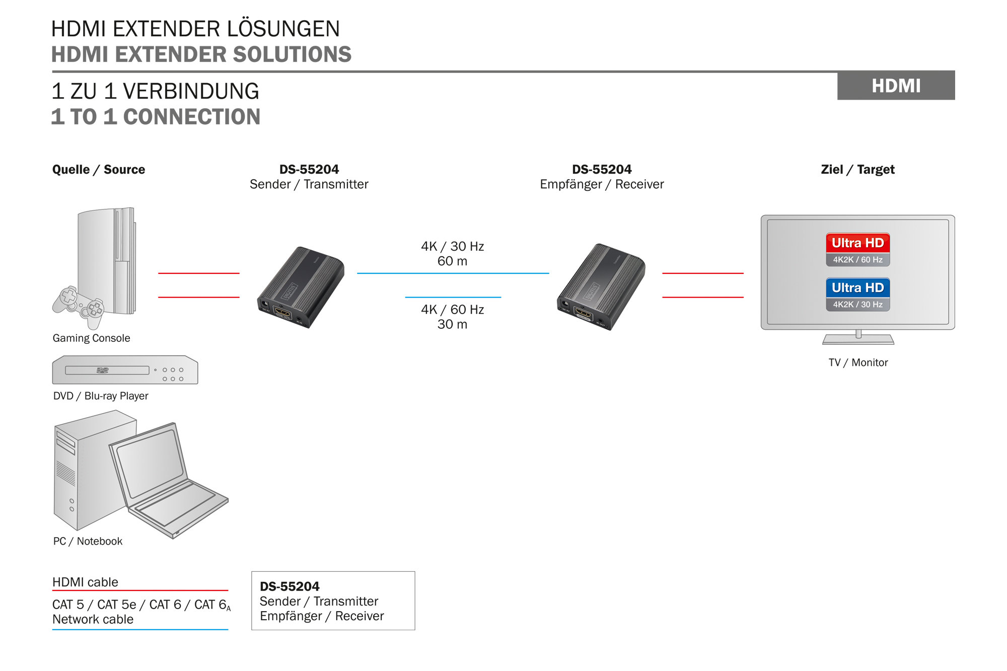 Digitus HDMI Sinyal Uzatma Cihazı, 1 x Alıcı (Receiver), 1 x Verici (Transmitter) Birim dahil, maksimum 60 metre, UHD 4K2K/60 Hz, HDMI 2.0, HDCP 2.2