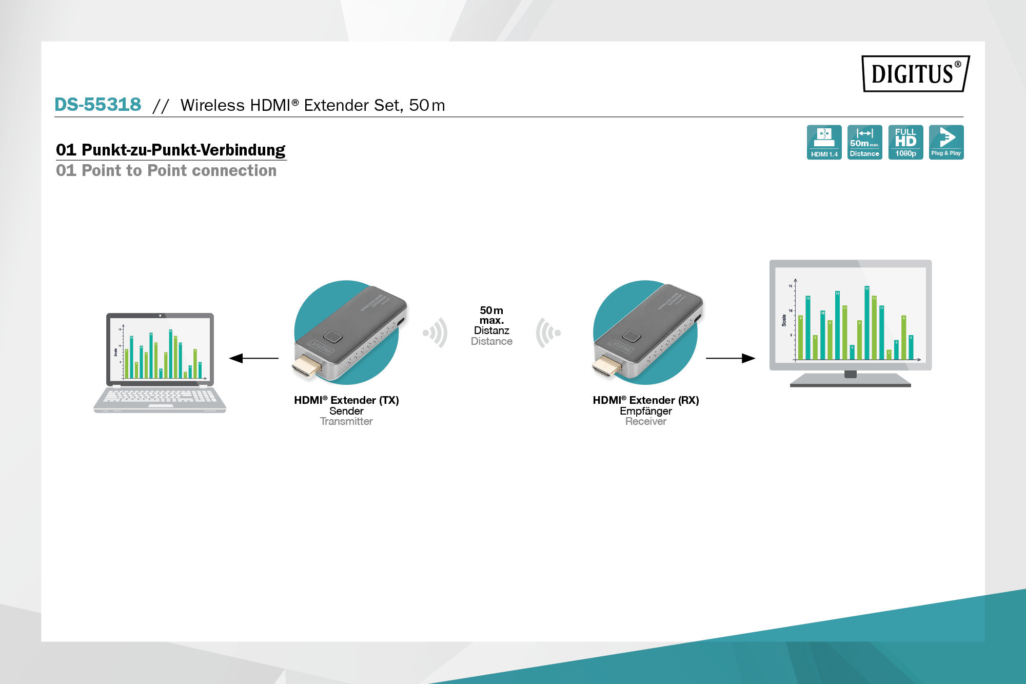 HDMI video ve ses sinyallerini Full HD olarak 50 metreye kadar mesafeye engelsiz bir görüşle kablosuz olarak iletebilirsiniz. Sınırlı bir görüş mesafesine sahip iletim mesafesi genel olarak belirlenemez ve kullanıldığı yerdeki çevresel koşullara bağlıdır. Duvarlar, camlar vb. sinyal aralığını kısaltır veya sinyal kayıplarına neden olur.