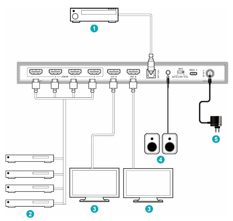 Digitus 4x2 HDMI Matrix Switch, 4K/60Hz Scaler özelliği, EDID, ARC, HDCP 2.2, 18 Gbps