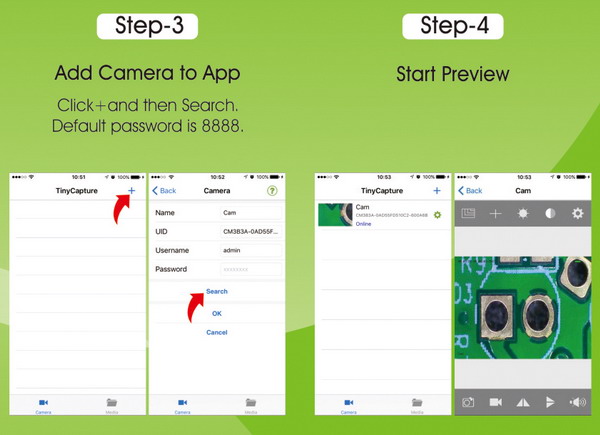 Uygulama: iOS: TinyCapture (App Store), Android: TibyCapture (Google Play)
