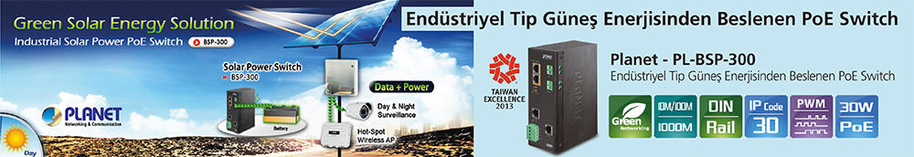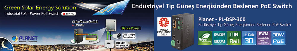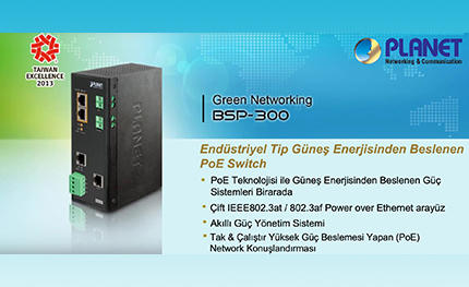 Network sistemlerinin her ortamda ve çevrede kullanılması yönündeki talepler karşısında PLANET, PL-BSP-300 Endüstriyel Tip Güneş Enerjisiyle Çalışan PoE Switch ürününü piyasaya çıkardı. Sıfır-Karbon emisyon kaynağı güneş ışığından beslenen PL-BSP-300, güneş panellerinin bataryalarla aynı voltaj beslemesinde çalışmasını sağlayan Pulse Width Modulated (PWM) şarj kontrol mekanizmasına sahip. PL-BSP-300, coğrafya bakımından fiziki bir engel olmaksızın PoE network cihazlarına elektrik takviyesi sağlayan bir ürün.