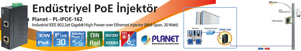 Endüstriyel Tip IEEE 802.3at Gigabit High Power over Ethernet Injector (Mid-Span, 30 Watt)